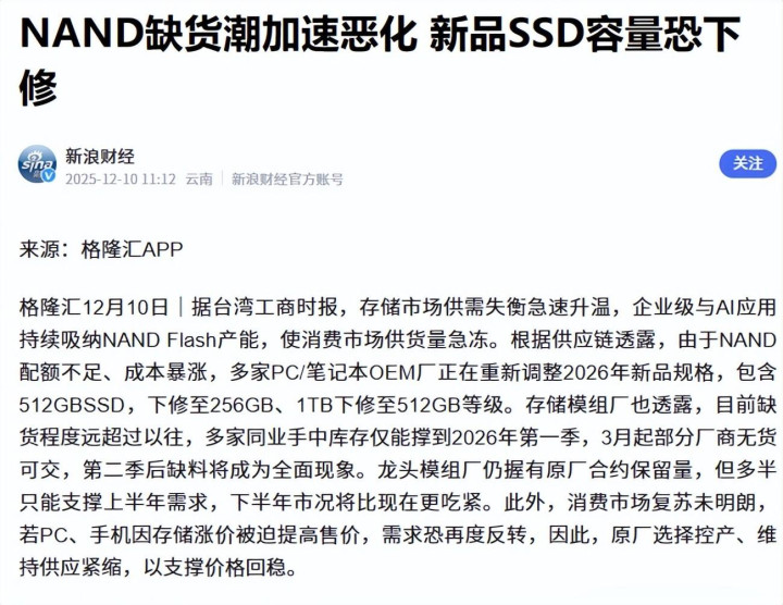 来自供应链的音问,为了应酬NAND闪存的贫窭和暴涨,多家PC、OEM厂商正在诊疗2026年新品SSD规格,诡计将本来主流的 512GB SSD 降至 256GB,本来诡计搭载 1TB 的机型可能降至 512GB,以防家具价钱翻倍吓跑消费者。
