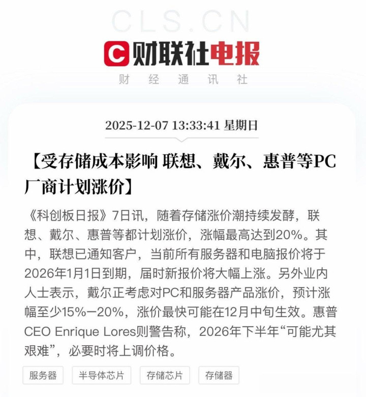 在资本压力下,厂商濒临“加价”或“缩水”两难礼聘,而部分厂商已启动提价。此前,戴尔已告示从本月中旬起上调零卖价钱,涨幅展望在 15%~20% 之间。联思诡计于2026年1月起跟进,上调PC家具售价。
