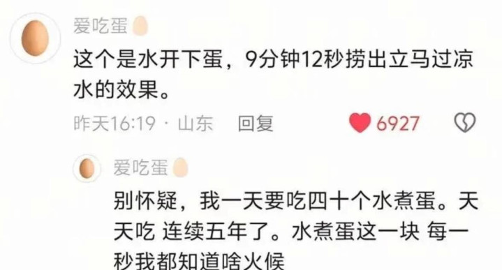 “水开下蛋,9分12秒捞出,立即过冷水。”博主“爱吃蛋”在一条对于水煮蛋的视频下留住对于水煮蛋的精确驳倒,短短几天时候,其粉丝已接近300万。