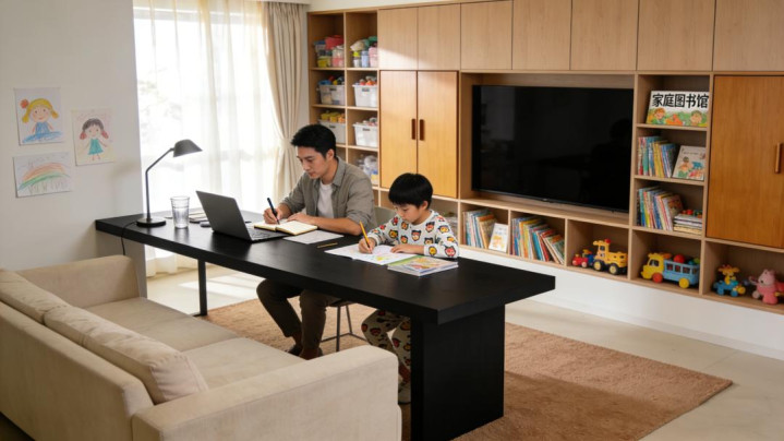 想象冷漠:书香气味是最佳的掩盖。①用“长书桌”替代茶几,家长不错在这里办公,孩子在把握写功课,既能兼顾我方的责任阅读,又能实时解答孩子的学习问题;②电视墙定制整面收纳柜,闭塞柜收纳杂物,通达格放书本和掩盖品,打造“家庭藏书楼”的氛围。