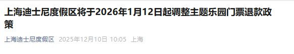上海迪士尼度假区官方微信号12月10日告示,将于2026年1月12日起优化上海迪士尼乐土门票退改策略。